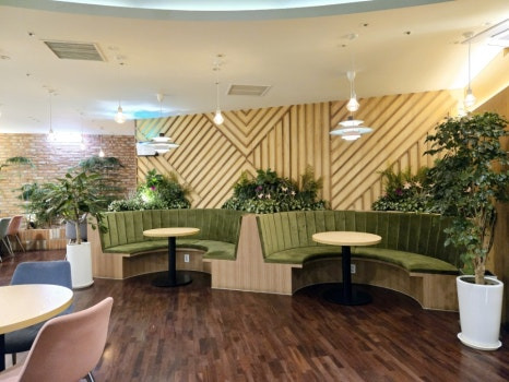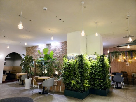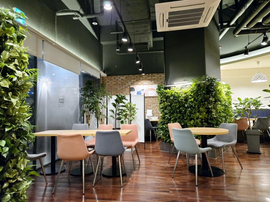 - 식물 인테리어: 천장부터 벽면까지 대형 나무와 다양한 화분이 배치되어 도심 속 오아시스 같은 느낌을 줍니다. 특히 초록색 잎사귀 장식이 포토존으로 인기