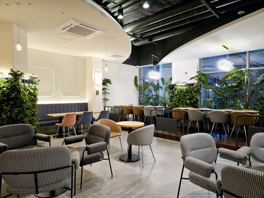 - 개인 공간: 창가 좌석은 채광이 좋아 노트북 작업에 적합하며, 반짝이는 조명 아래 1인용 소파석도 마련.
