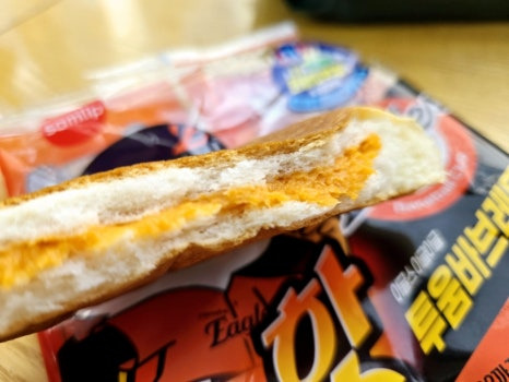 빵은 약간 퍽퍽하지만 고소한 맛 덕분에 크게 거슬리지는 않았습니다. 원래 뻑뻑이 좋아하는 일인이라...ㅎㅎ 담백한 빵과 매콤한 소스가 잘 어우러져 간단하지만 든든한 간식으로 좋을꺼 같아요.