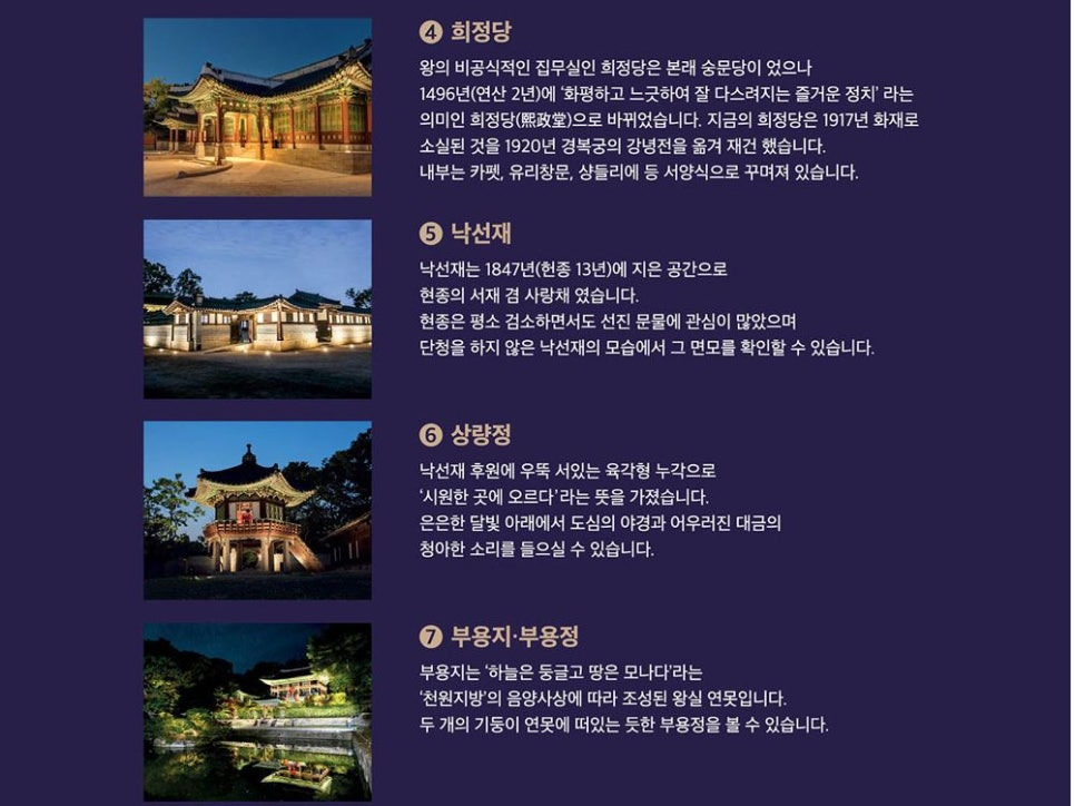 - 입구(금호문 또는 돈화문) → 진선문 → 인정전(왕의 집무실, 야경 명소) → 희정당 → 낙선재(왕비 공간) → 상량정(대금 독주) → 부용지(연못, 포토존) → 애련정 → 연경당(전통 공연장) → 후원 숲길 → 출구