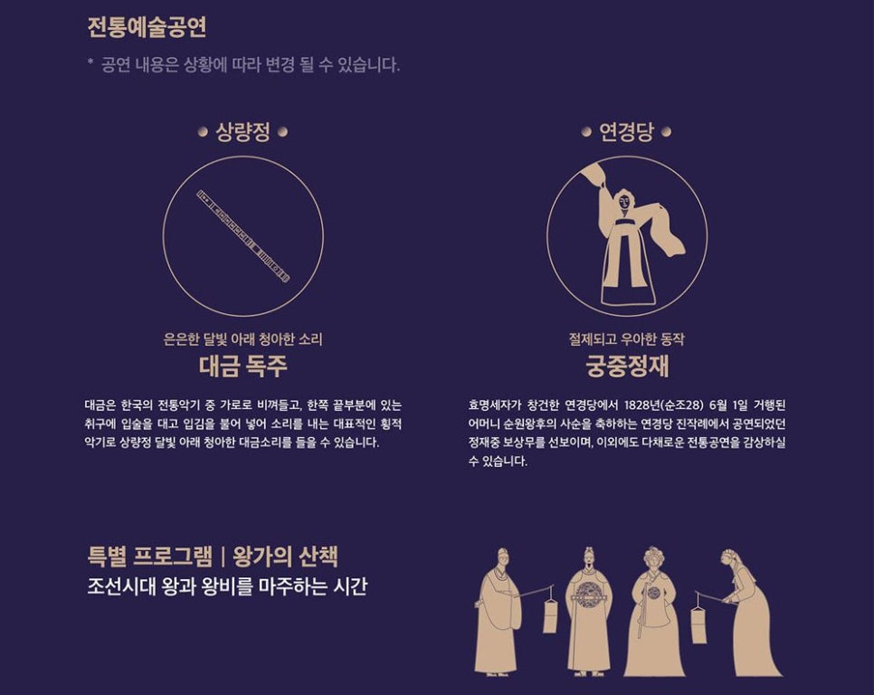 - 연경당 궁중 무용/국악 및 왕·왕비 퍼포먼스: 시그니처 공연!