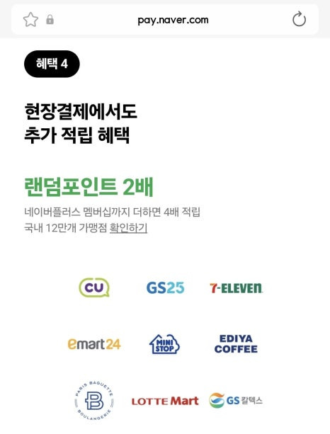 두 번째로 엄청난 매력은 바로 결제 시 적립되는 네이버페이 포인트! 온라인 결제할 때는 최대 3%까지 포인트가 적립되고, 오프라인 매장 결제 시에는 ‘포인트 뽑기’라는 이벤트를 통해 랜덤으로 포인트를 더 받을 수 있습니다.