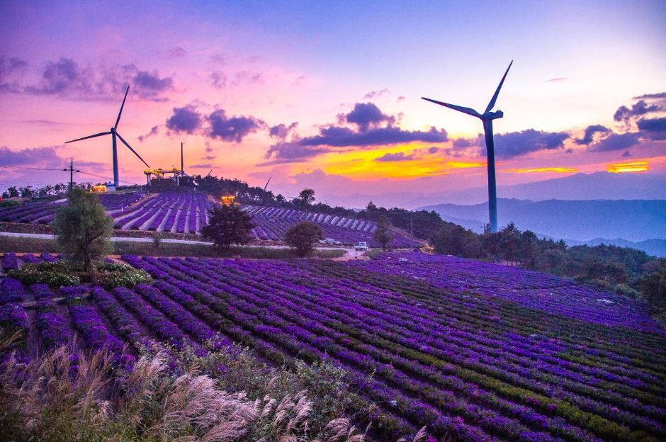 별바람언덕에서는 거창, 지리산, 덕유산, 가야산까지 탁 트인 산자락 전경을 조망할 수 있어, 산과 꽃 그리고 하늘이 어우러진 환상적 풍경을 감상하기에 최적입니다.