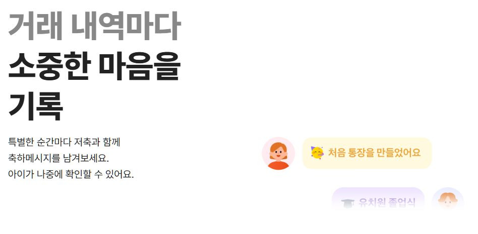 ✔ 주요 특징: 아이 명의 개설, 육아 편지 기록, 부모 공동 관리, 이체 한도 설정 가능