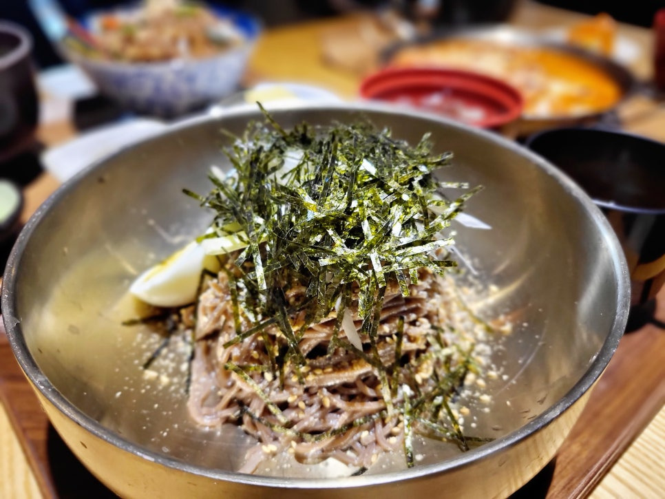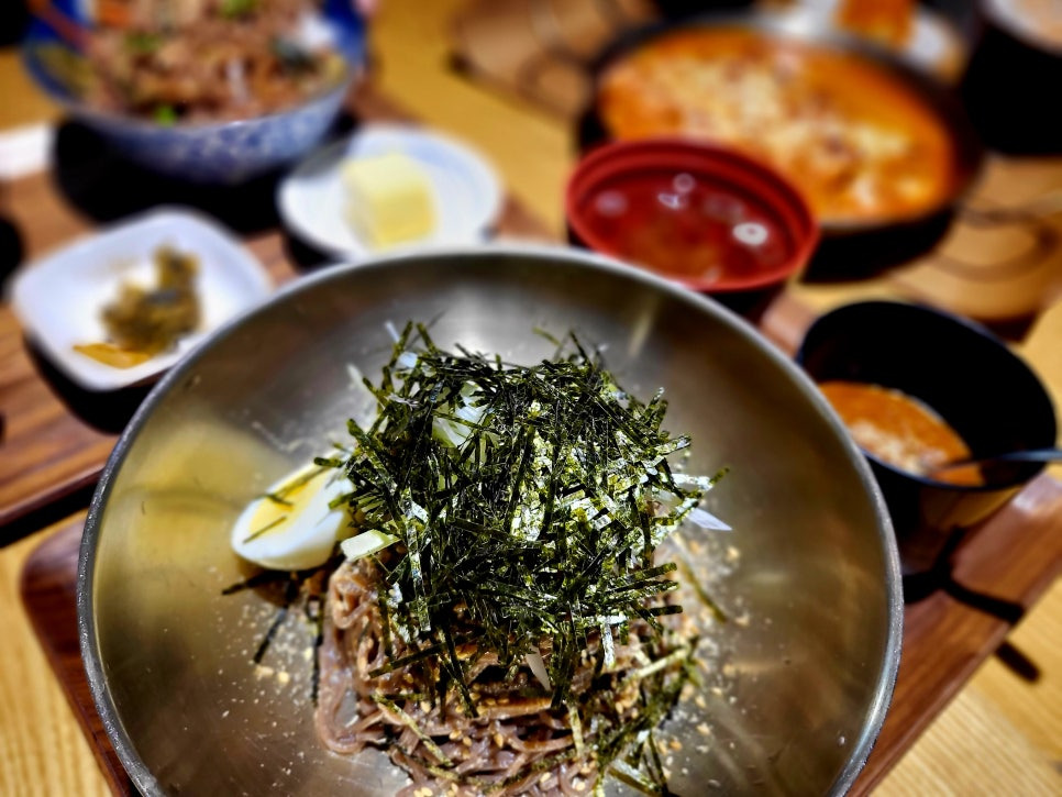 참깨비빔소바를 먼저 맛봤어요. 와, 이건 정말 신세계였어요! 고소한 참깨 향이 코끝을 자극하면서 입안 가득 퍼지는 맛이 일품이었죠. 소바 면은 쫄깃하면서도 부드러워서 소스와 잘 어우러졌어요.