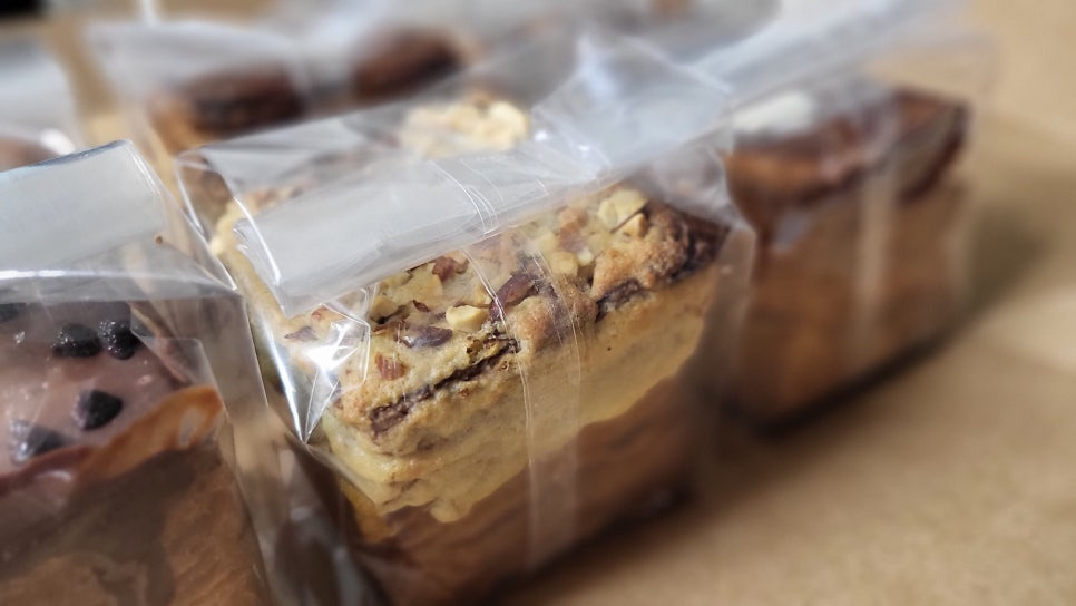 코메큐브는 코메코 베이커리의 시그니처 메뉴입니다. 페스츄리와 식빵을 합친 듯한 독특한 모양이 눈길을 끌었어요. 다양한 맛이 있었지만, 저는 가장 기본적인 플레인부터 시작해 블루베리, 슈크림 맛을 골랐습니다.