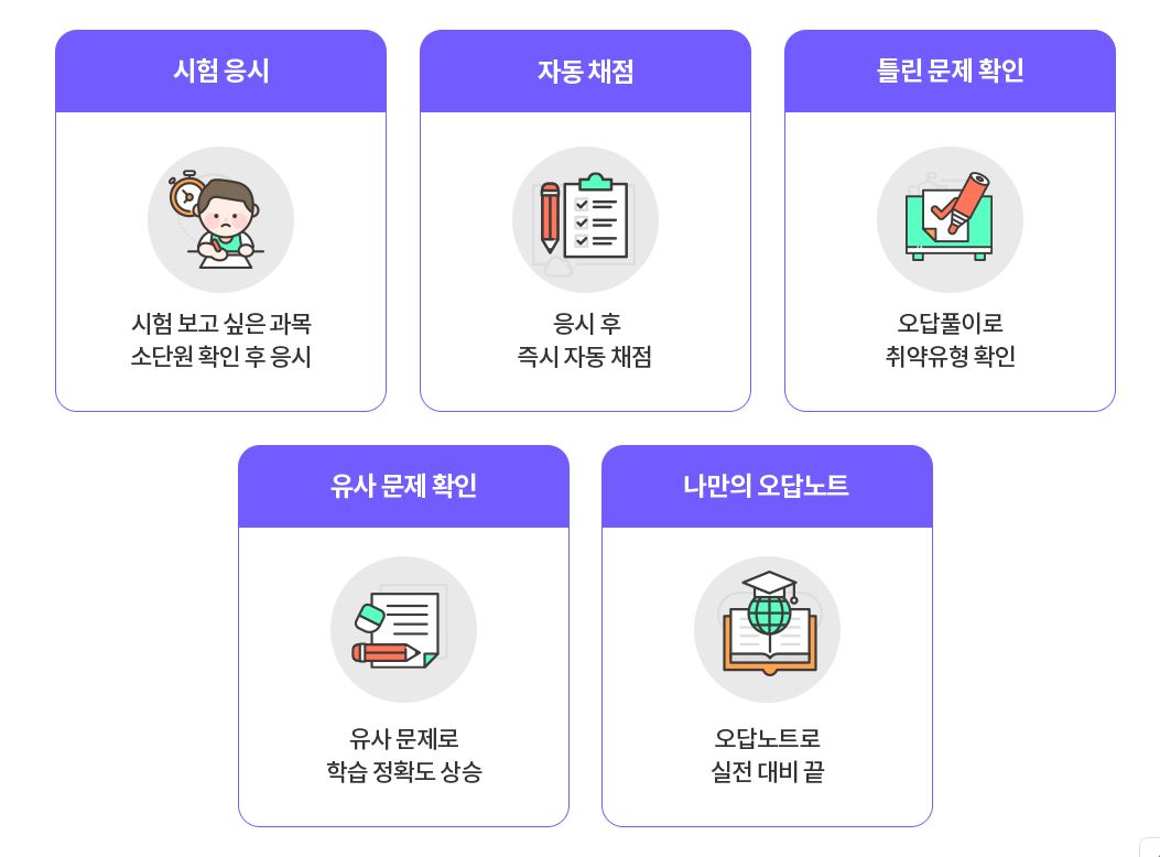 | 특징 | 전문 출제진 330명 참여, 1,000만 문제 데이터 기반, 출판사/과목/단원별 문제 선택 |